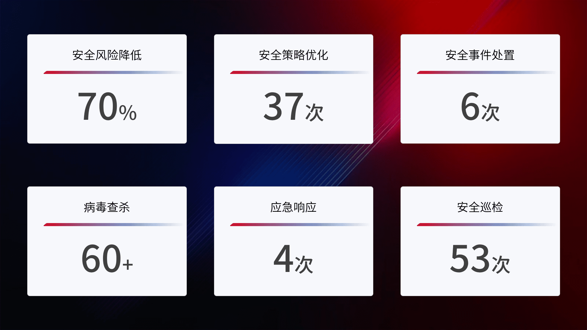 提供全面的安全事件报告体系,,包括处置报告、、周报、、季度和年度总结,,,结合持续监控,,帮助客户深入了解网络安全状况。。。。